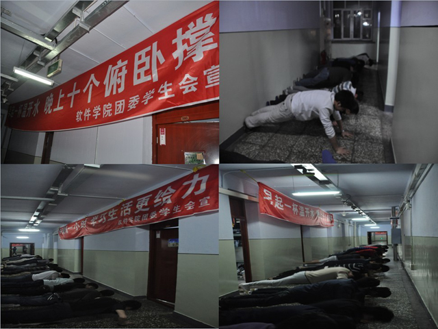 每周一、三、五晚上同学们在公寓的走廊里以寝室为单位每人做10个俯卧撑,在寝室做俯卧撑的方式简单,节约时间,同时大家还可以互相监督,逐渐养成了良好的健身习惯,强健同学们的体魄,提高了同学们的学习效率,保证学风。