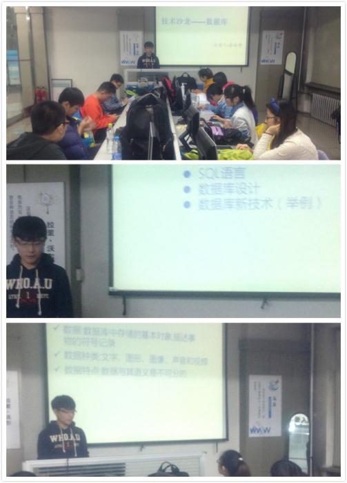 李环宇同学从数据库管理系统开始讲起,由浅入深,在基本知识中加入了自己的理解和经验。之后他还讲授了关系数据模型,希望通过自己的语言更简明扼要地让听众们对数据库的基本概念有确切的了解。讲过基础知识后,李环宇同学引出了本次讲座的重点,SQL语言。SQL是一种数据库查询和程序设计语言,用于存取数据以及查询、更新和管理关系数据,是数据库的精髓所在。他通过一个生动的实例来具体地为大家介绍了数据库设计的方法,在枯燥的知识中增添了乐趣,吸引了大家对于数据库设计的兴致。并从具体的应用中来为大家展示数据库设计的重要性和魅力所在。在沙龙的最后,李环宇同学毫无保留地为大家推荐了自己觉得对数据库设计方面有帮助的参考书,希望能为对数据库相关知识感兴趣的同学们提供帮助,共同进步。可以说,这次李环宇同学主讲的沙龙是非常成功的,他在有限的时间里,为听众们展示了数据库设计的魅力,提供了具体的帮助。