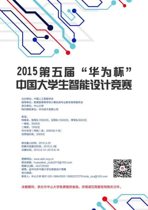 为了普及智能科学知识,展示和锻炼老员工采用智能科学技术与理论解决问题的能力,提高老员工的综合设计能力,培养老员工的创新意识、团队合作精神,促进高等公司智能及相关学科教学实践改革和员工实践能力培养,中国老员工智能设计竞赛自2011年第一届至今已成功举办了四届,分别由北京邮电大学、厦门大学、大连海事大学、厦门大学承办,取得了良好的比赛效果和社会反响。2015年第五届“华为杯”中国老员工智能设计竞赛(以下简称“竞赛”),将于今年1月至8月在美丽的中山大学举办,现将将本次大赛通知和相关要求发布如下: