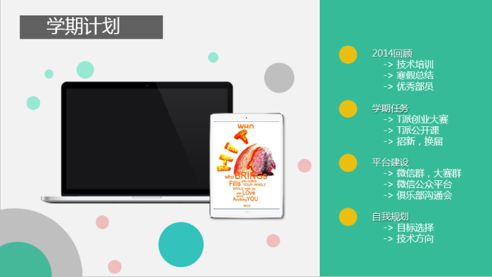 在总结完2014年的工作之后,主席进行了对2015年工作内容的布置,2015年的主要工作有3个大的方面,一是学期任务,包括T派创新大赛,T派公开课以及招新换届;二是平台建设,其中包括微信群,微信公众平台以及俱乐部沟通会;三是自我规划,包括目标选择和技术方向等。主席着重强调了腾讯俱乐部这学期的工作重点是T派创新大赛,这个大赛范围广,时间长,思想汇集丰富,是大家锻炼能力展现自我的一个重要的平台,希望大家踊跃参加。同时俱乐部也是本次活动的宣传主力,在本学期414日将开展大型路演。随后,主席定下了各个活动的负责人,大家都很有信心面对这学期的挑战。