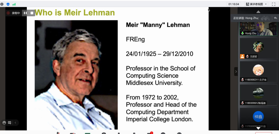 Hong Zhu教授介绍了软件进化中的Lehman理论。首先,介绍了Lehman理论的三个组成部分,包括:Lehman根据软件系统的进化特征对软件系统进行的分类;软件不确定性原理、Lehman对软件为什么会进化以及如何处理软件工程中的进化问题的回答;软件进化规律。然后,与在线师生讨论了如何将Lehman理论应用于回答科学研究中的问题和解决实际问题。重点讨论了当今前沿计算机应用程序中的软件工程问题,包括:人工智能应用程序、数字货币和区块链应用程序、支持5G的应用程序等。