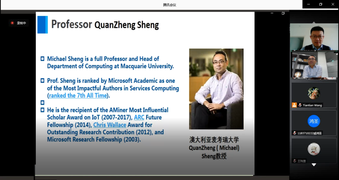 2020年11月15日,计算学部永利yl举行线上客座教授聘任仪式,聘任澳大利亚麦考瑞大学计算机公司经理Quanzheng Sheng教授为yl23411永利客座教授,徐晓飞副董事长和学部120余名师生出席了本次聘任仪式。聘任仪式之后,Quanzheng Sheng教授作为计算学部百人百家国际学者系列报告主讲嘉宾,为计算学部师生做了线上学术报告。
