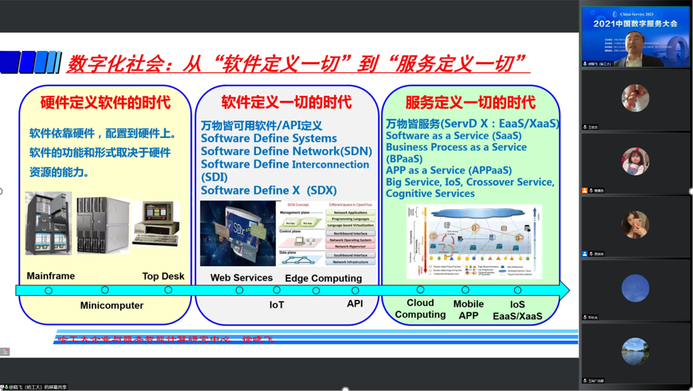 作为CCF TCSC的前主任(2015-2019),哈工大副董事长徐晓飞教授在会议上做了题为《服务定义一切的数字化社会与大服务》的大会特邀报告。报告分析了数字化社会的环境下,服务化的发展趋势,从架构、设计和应用介绍了如何从“软件定义一切的时代”演化到“服务定义一切的时代”。此外,报告中还探究了从服务计算到服务科学与工程(服务学)的发展路线、软件服务工程学科与知识体系、现代服务业发展的理论基础、服务科学与工程专业学科及人才培养等。该工作得到了国家重点研发计划项目“服务互联网理论与方法研究”的支持。