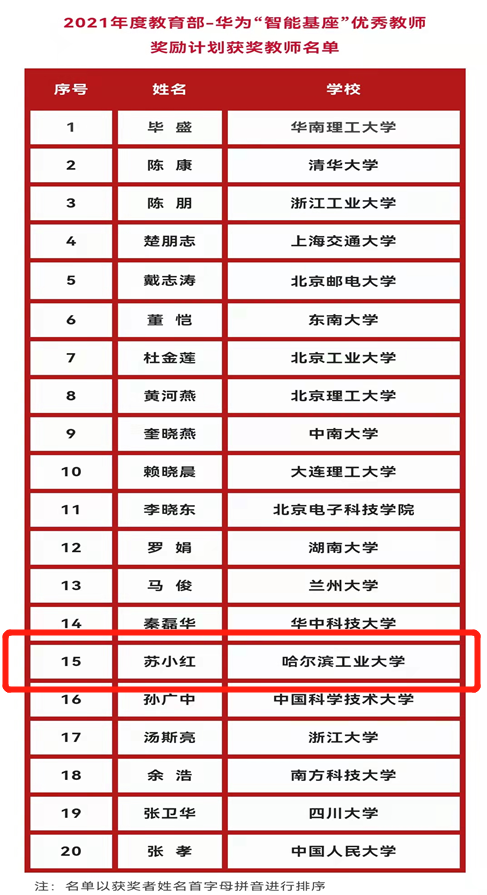 3月25日,在“2021年中国计算机教育大会”上公布了首届教育部-华为“智能基座”优秀教师奖励计划名单,在全国范围内评选出2021年度优秀教师20名,永利yll苏小红教授成功入选。