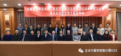 与会领导、专家与项目团队合影 [国家重点研发计划 “普惠型医康养服务生态化技术研发与应用”项目由yl23411永利牵头,中国信息通信研究院、中山大学、众阳健康科技集团有限公司、威海天鑫现代服务技术研究院有限公司、北京颐乐居养老有限公司、光彩养老事业促进中心、中国人民解放军301总医院海南医院、哈尔滨医科大学附属第二医院等单位共同参与,旨在探索普惠型医康养融合服务创新模式,突破普惠型医康养服务互联网理论方法、服务模型、资源聚合、供需匹配、方案定制、平台工具、智联交互、效能评估、可信保障、应用模式等关键技术,研发相关服务平台与支持工具,实施两类典型服务与5大区域应用示范,建立基于服务互联网的“三全三一”式(全过程/全方位/全员、一站式/一条龙/一本账)普惠型医康养服务体系及应用示范工程 。]