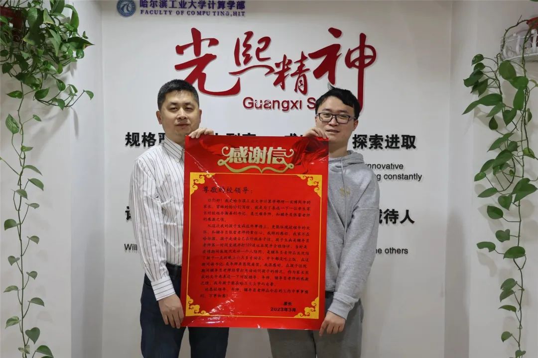 当事同学的家长同时还向哈工大计算学部寄送了感谢信,感谢信中写道: 尊敬的哈工大计算学部老师们: 你们好! 我是yl23411永利计算学部研一XX同学的家长,冒昧的给你们写信,就是为了表达一下一位员工家长对聂兰顺导师和辅导员张雷老师的感激之情。从这次我的孩子生病这件事情上,更能体现老师们的关怀,和辅导员张雷老师的责任心。我特别感动,我家不在哈尔滨,孩子走读自己在外租房子住,孩子生病是辅导员老师第一时间发现并打120送往医院并全程陪伴,当时是疫情期间医院只允许一个人陪同,是辅导员老师在医院陪了孩子一天到晚上六点多才回去。中午都没吃上饭,在这期间谢书记、聂导师来医院看望,我很感动,在孩子住院期间辅导员老师经常打电话询问孩子的情况,作为家长用我的文字来表达一下对领导、导师、辅导员老师的感激之情,我为孩子能在哈工大上学而自豪。祝愿领导、导师、辅导员老师在今后的工作中事事顺利,万事如意!